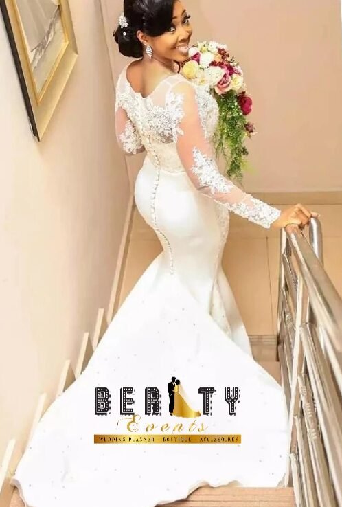 Robe de mariée sirène,  manches longue avec dentelle couleur chair, amovible au niveau des jambes