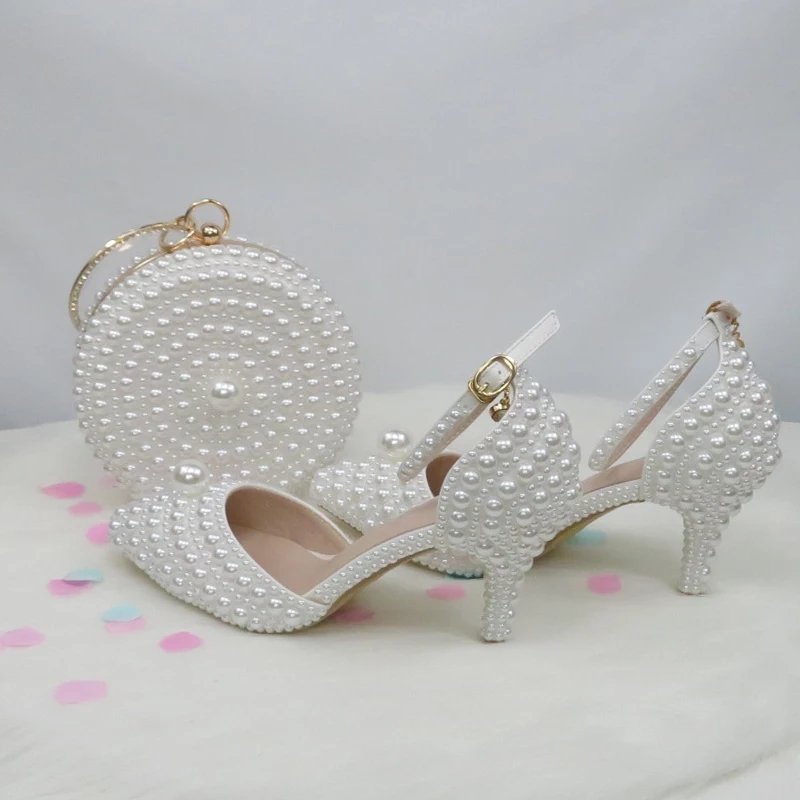 CHAUSSURES BRIDAL de mariage à petit talons, et bout pointu, ensembles chaussures et sacs à perles blanches , avec une fine lanière à la cheville. S’adapte à la taille, prenez votre taille normale.